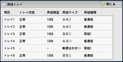 2. 表示された画面で各用紙トレイの状態を確認します。