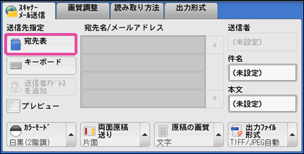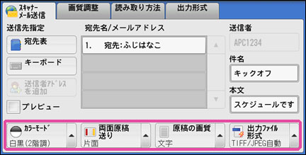必要に応じて、[カラーモード]、[両面原稿送り]、[原稿の画質]、[出力ファイル形式]などの項目を設定します。