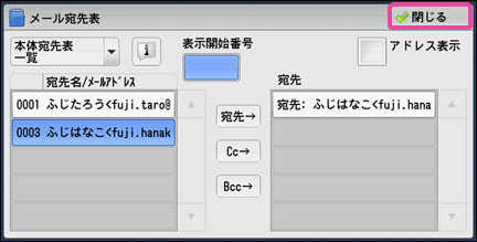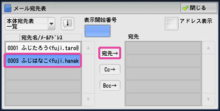 【補足】- 必要に応じて、宛先表の中から[Cc→]、[Bcc→]を選びます。