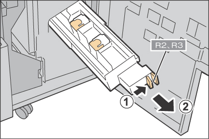 レバー[R2]、[R3]を右側に押しながら(1)、ユニットを引き出します(2)。