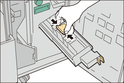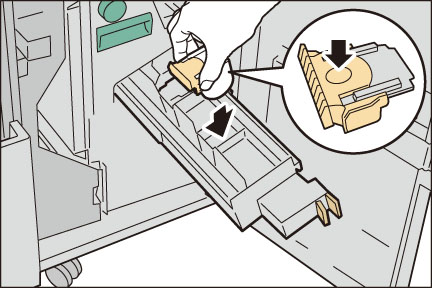 新しい中とじホチキスカートリッジの、左右のオレンジ色の部分を持ちながら元の位置に戻し、くぼんでいる部分を上から強く押して、カチッと音がするのを確認します。