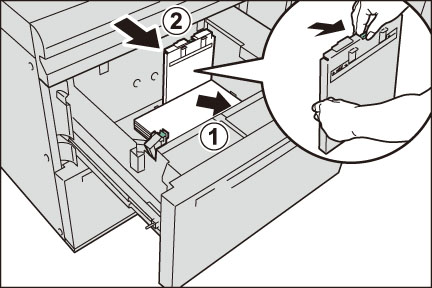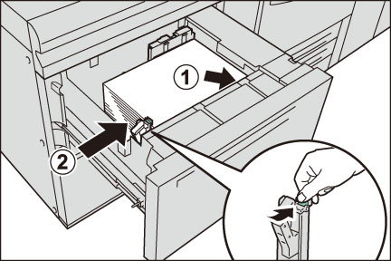 コピー、またはプリントする面を上にして、用紙を矢印の方向にそろえて約100~500枚セットします(1)。縦ガイドクリップを指でつまみ、用紙サイズに合わせます(2)。