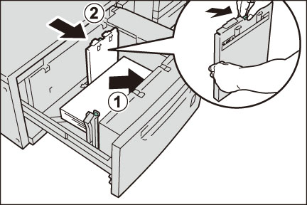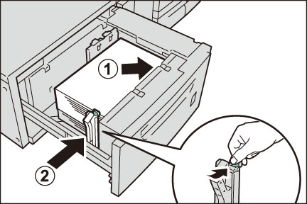 コピー、またはプリントする面を上にして、用紙を矢印の方向にそろえて約100~500枚セットします(1)。縦ガイドクリップを指でつまみ、用紙サイズに合わせます(2)。