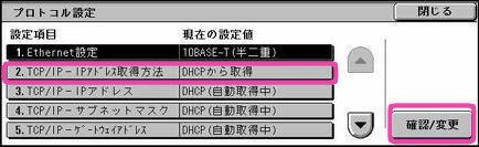 [TCP/IP-IPアドレス取得方法]を選び、[確認/変更]を押します。