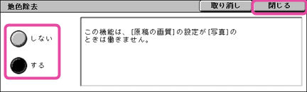 - [原稿の画質]の設定が[写真]の場合、[地色除去]の機能は働きません。