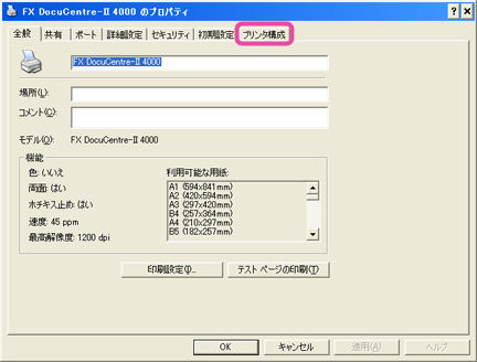プリンターのプロパティから、用紙トレイの設定状況や使用できるオプションの設定および状態などの最新情報を取得することができます。