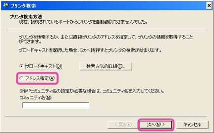 [アドレス指定]を選び、[次へ]をクリックします。[TCP/IP]に本体のIPアドレスを入力し、[完了]をクリックします。