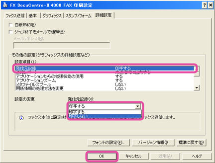 [設定項目]の一覧から[発信元記録]を選び、[設定の変更]で[印字しない]を選び、[OK]をクリックします。