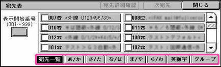 [宛先表]から、[宛先一覧]、[あ/か]~[ら/わ]のふりがな、[英数字]、[グループ]などを利用してファクス番号を検索します。