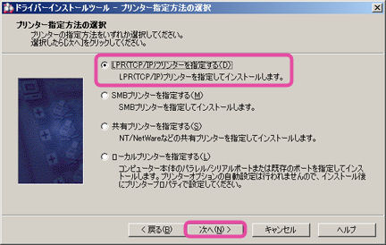 [LPR(TCP/IP)プリンターを指定する]を選び、[次へ]をクリックします。