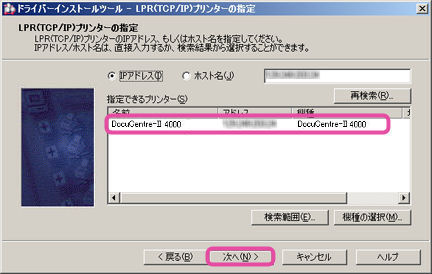 お使いの機種を[指定できるプリンター]から選び、[次へ]をクリックします。