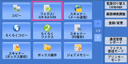 メニュー画面の[ファクス/インターネットファクス]を押します。