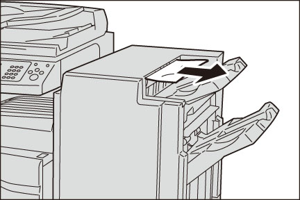 排出トレイの排出口から用紙が出ている場合は、用紙をゆっくり引き抜いて、取り除きます。