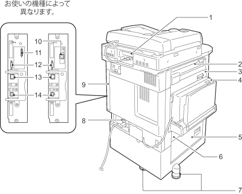 | 6 | 左側面下部カバー[B] | 紙詰まりを処置するときに開けます。用紙トレイ6が装着されている場合は、用紙トレイ6を左に移動してから開けます。 |