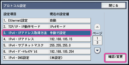 [IPv4-IPアドレス取得方法]を選び、[確認/変更]を押します。