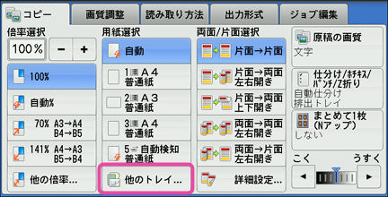補足- 上の画面が表示されないときは、[用紙選択]>[他のトレイ]>[5 手差し]を押してください。