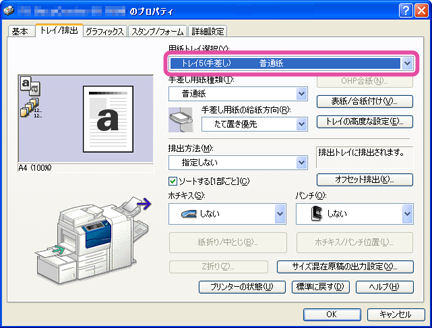 プリンタードライバー画面で、[トレイ/排出]タブの[用紙トレイ選択]から[トレイ5(手差し)]を選びます。