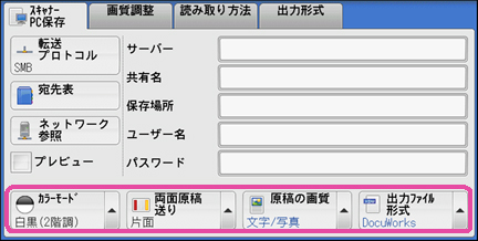 必要に応じて、[カラーモード]、[両面原稿送り]、[原稿の画質]、[出力ファイル形式]などの項目を設定します。