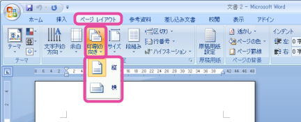 [ページレイアウト]タブを開き、[印刷の向き]>[縦]または[横]を選びます。