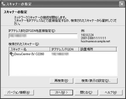 [スキャナーの指定]画面が表示されるので、スキャナーのIPアドレスを入力するか、または[検索されたスキャナー]から接続するスキャナーを選び、[次へ]をクリックします。