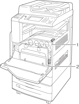 | 2 | 主電源スイッチ | 主電源スイッチの[○]側を押すと、操作パネルの右側にある<主電源>ランプが消灯し、本体の電源が完全に切れます。ファクス機能をお使いの場合、主電源を切るとファクスのメモリーに蓄積されている内容が消去されることがあるので、ケーブルの接続や清掃などを行う場合を除き、通常は主電源スイッチを切らないでください。 |