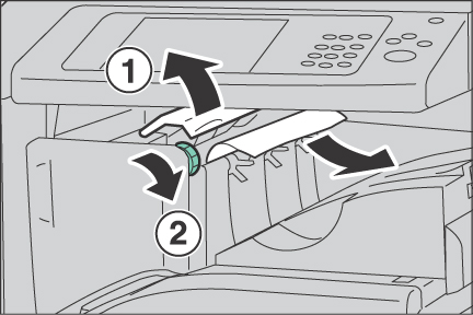 フィニッシャーの上面カバーを開け(1)、ノブを回して(2)、詰まっている用紙を取り除きます。