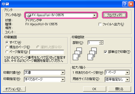 [プリンタ名]から、封筒を手差しトレイにセットするで封筒をセットした本体を選び、[プロパティ]をクリックします。