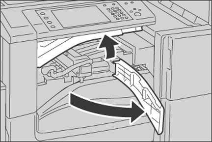 機械が停止していることを確認し、フィニッシャー接続部上面カバーを上に持ち上げてから、フィニッシャー接続部前面カバーを前に開けます。