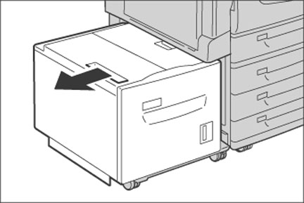 用紙トレイ6(大容量給紙トレイ)の上部左側にある取っ手を持って、左方向へ止まるまでゆっくりと移動します。