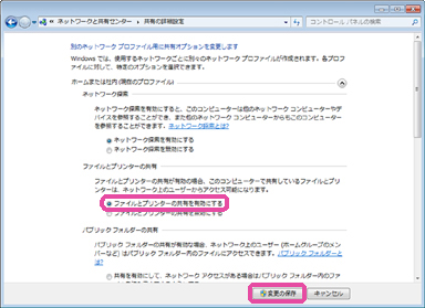 6. [ファイルとプリンターの共有]の[ファイルとプリンターの共有を有効にする]をオンにし、[変更の保存]をクリックします。