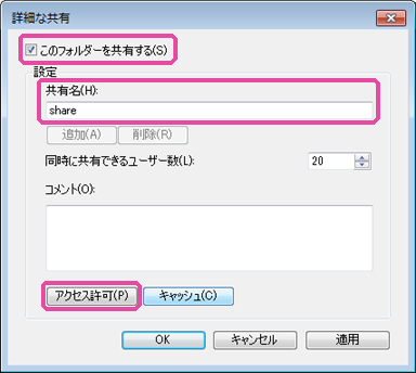 3. [このフォルダーを共有する]をチェック、[共有名]を設定し、[アクセス許可]をクリックします。