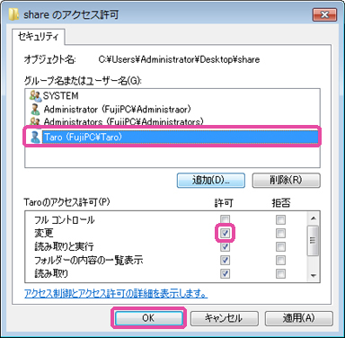 10. 追加したユーザーの[変更]の[許可]をチェックし、[OK]を選択します。