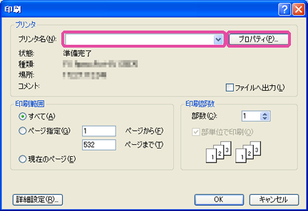 [プリンタ名]から本体を選び、[プロパティ]をクリックします。