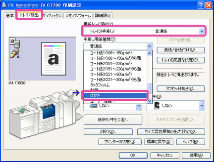 [トレイ/排出]タブの[用紙トレイ選択]で[トレイ5(手差し)]、[手差し用紙種類]で[はがき]を選びます。
