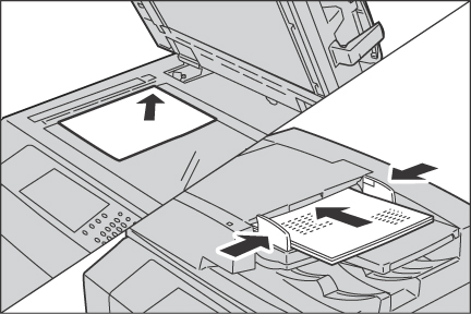 スキャンする原稿を原稿送り装置におもて面を上にしてセットするか、原稿ガラス上におもて面を下にして(1枚ずつ)セットします。