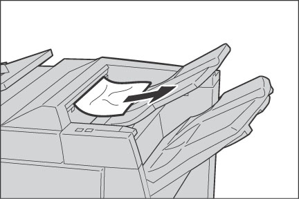 操作パネルにフィニッシャー排出トレイの排出口での紙詰まりを示すメッセージが表示されたら、次の手順に従って、詰まった用紙を取り除いてください。