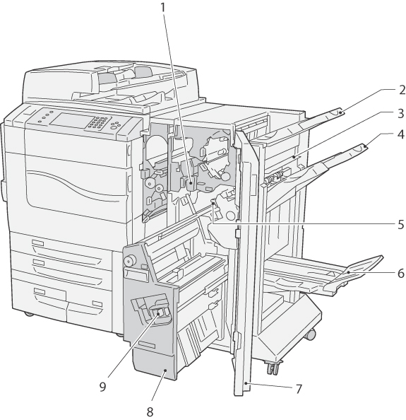 6 製本トレイ(中とじフィニッシャーC2のみ) 製本作成機能で折りを設定した場合、ここに排出されます。