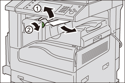 フィニッシャーの上面カバーを開け(1)、ノブを回して(2)、詰まっている用紙を取り除きます。