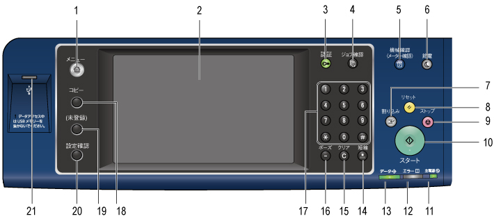 13 データランプ 本機からデータを送信中や、クライアントからのデータを受信中に、点滅します。また、機械内部に文書を蓄積しているときや、ファクス受信文書のプリント待ち、ファクス親展受信文書がボックス内に蓄積されているときは点灯します。