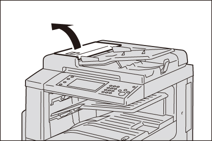 原稿送り装置の左側カバー手前の取っ手を引き上げて、止まるところまで開けます。