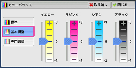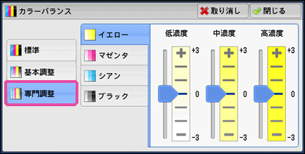 例: 中間濃度のイエローが薄くプリントされる場合、[イエロー]の[中濃度]をプラス(+)に設定します。高濃度 選んだ色の、濃い部分の濃淡を調整します。