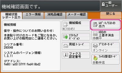 機械確認ボタンを押し、[レポート/リストの出力]を選択します。