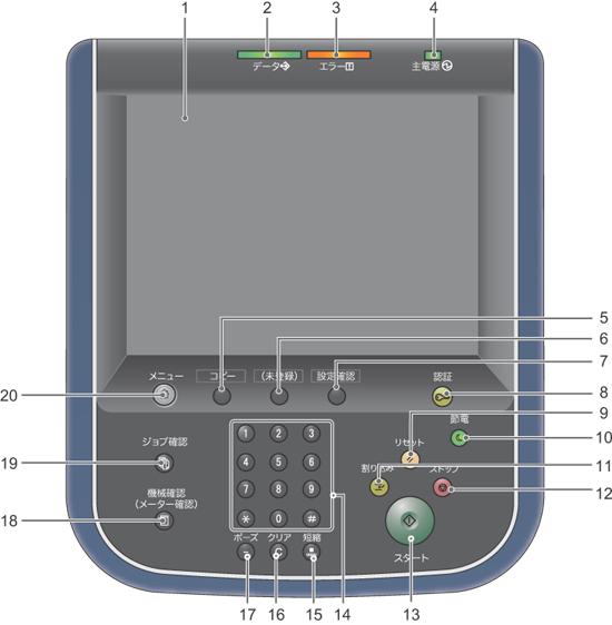 | 14 | 短縮ボタン | ファクスやメールなどで、短縮宛先番号で宛先を指定するときに押します。 |