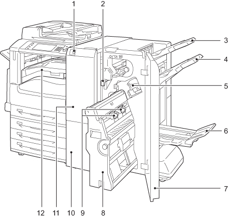 | 7 | フロントカバー | 紙詰まリの処置、ホチキス針の交換、針詰まりの処置、パンチ穴の切りくずを捨てるとき、このカバーを開けます。 |