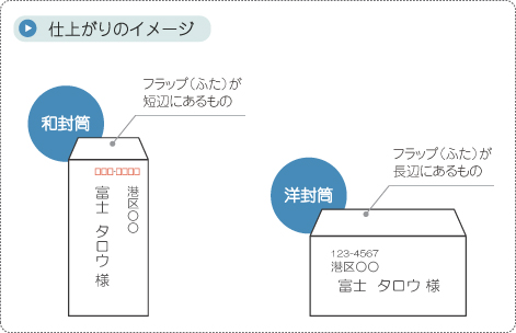 長形3号の和封筒と洋長形3号の洋封筒を例に、封筒の表面に宛名をプリントする方法を説明します。