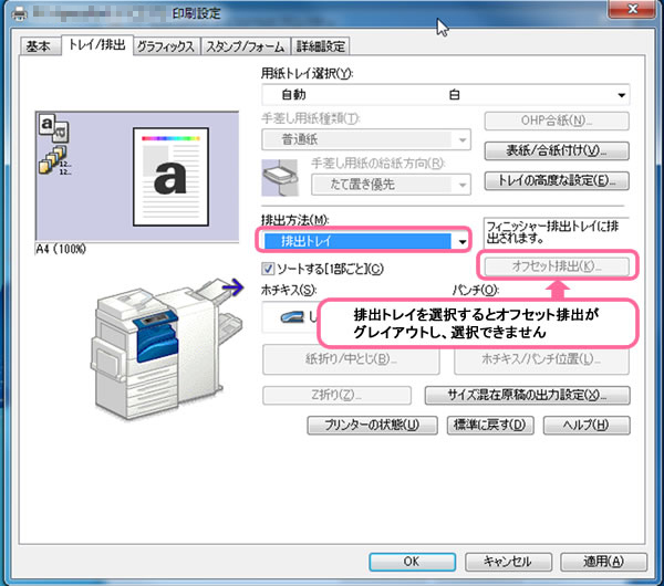 印刷設定>トレイ/排出タブの「排出方法」を「排出トレイ」に設定した場合、図のように「オフセット排出」が選択できません。