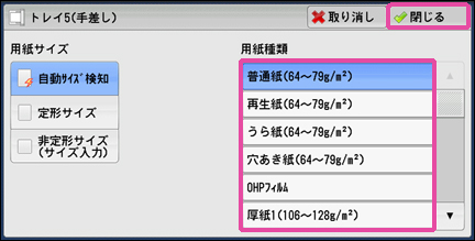 表示される画面で、[用紙種類]を選び、[閉じる]を押します。