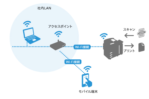 アクセスポイントを経由して、モバイル端末からプリントやスキャンができます。