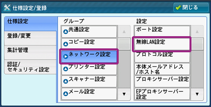 [仕様設定]>[ネットワーク設定]>[無線 LAN設定]を押します。