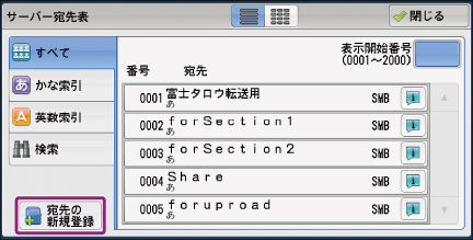- 機械管理者モードの設定や、すでに登録されている宛先数によっては、[宛先の新規登録]が表示されない場合があります。この場合は、設定状況や宛先登録数について機械管理者に確認してください。